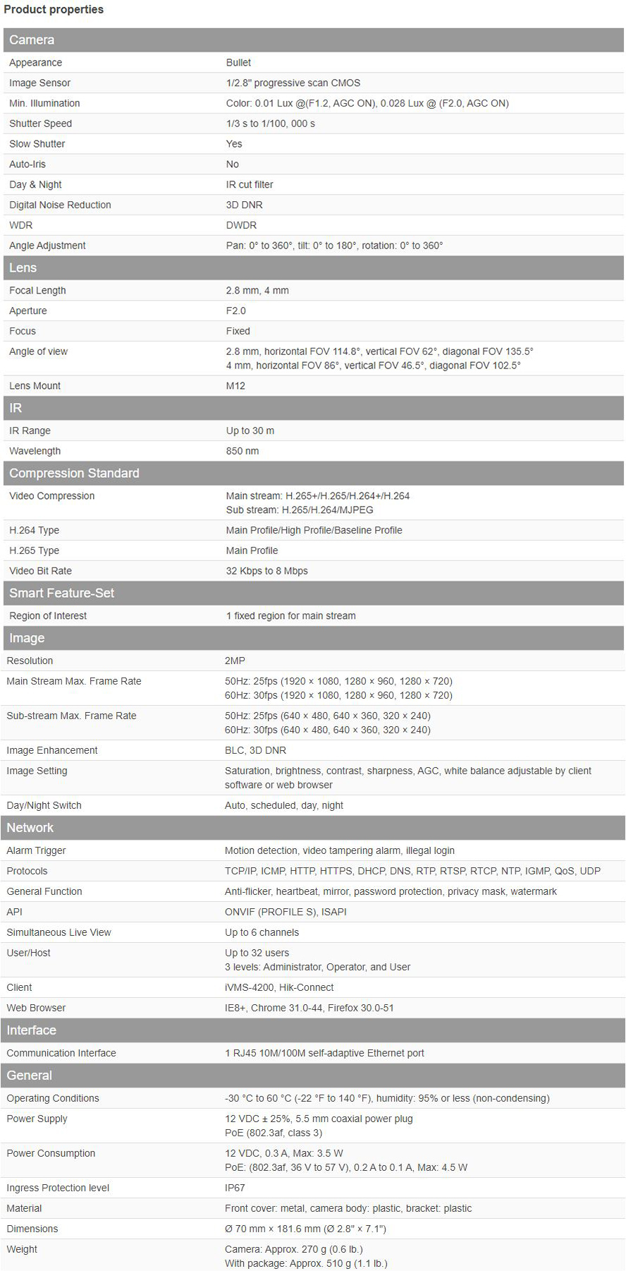 1/2.8" progressive scan CMOS 1920 ¡¿ 1080@30fps 2.8 mm/4 mm fixed lens H.265+/H.265/H.264+/H.264 Dual stream Digtal WDR (Wide Dynamic Range) 3D DNR (Digital Noise Reduction) Up to 30 m IR range PoE (Power over Ethernet) IP67