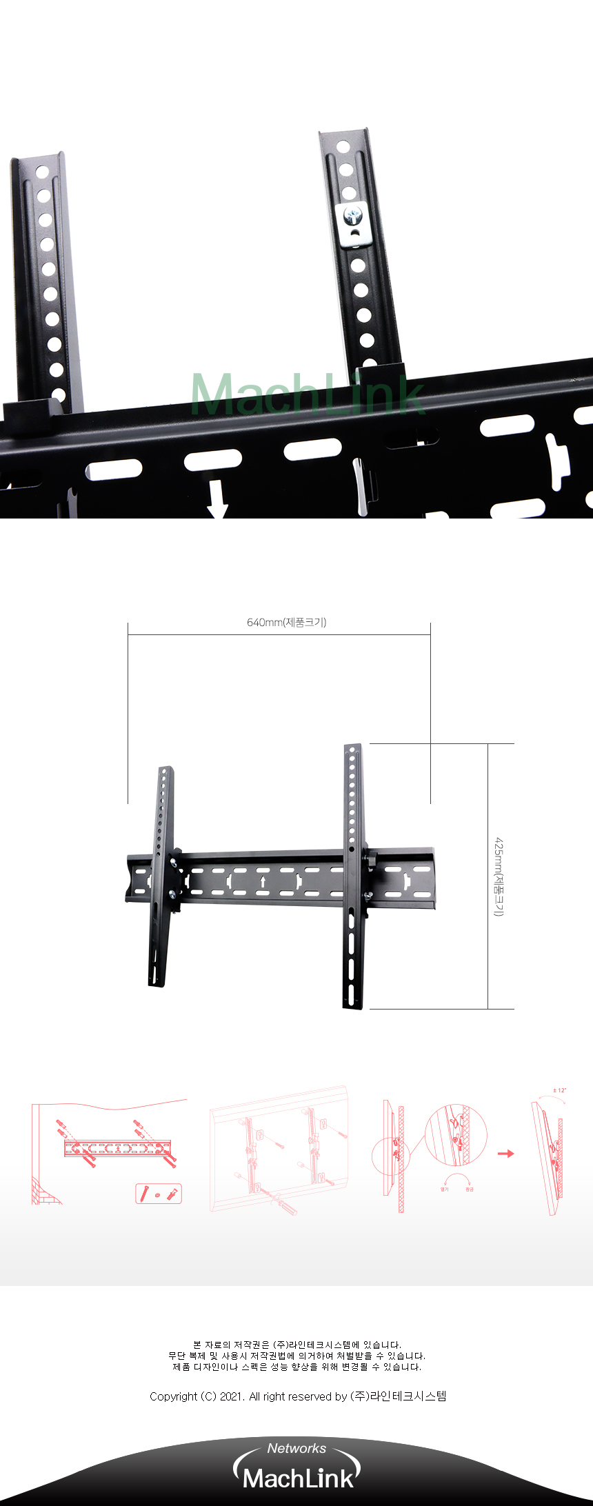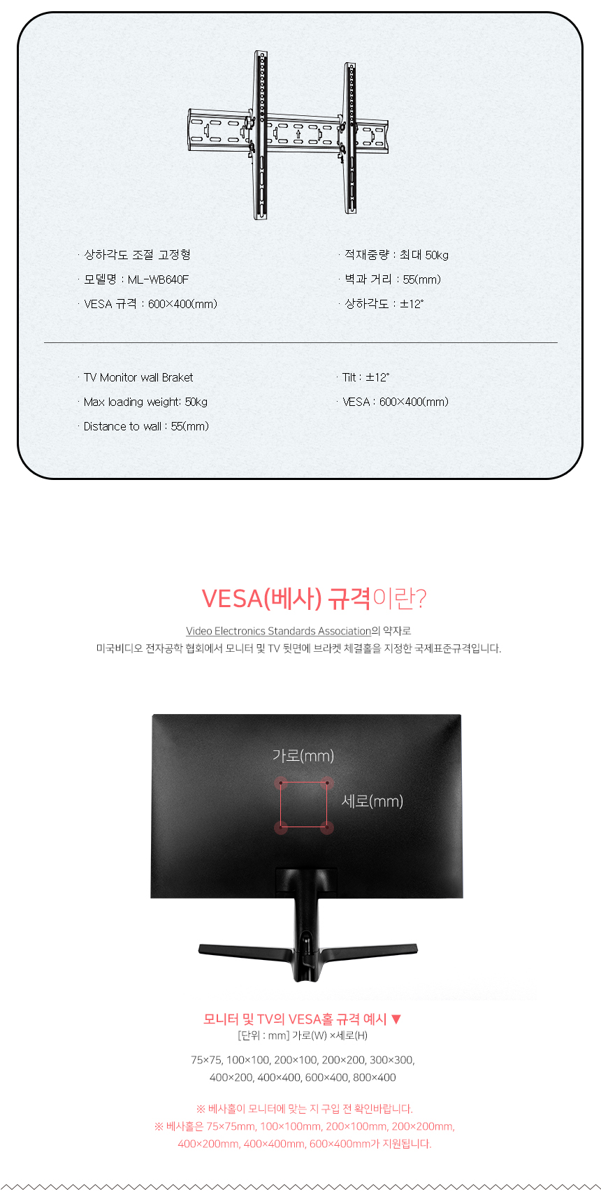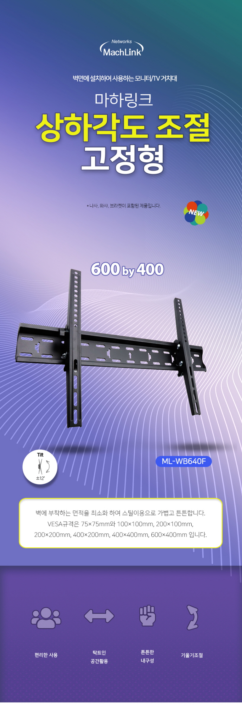 마하링크 TV 벽걸이 브라켓 600X400 상하 각도 조절 거치대 ML-WB640F